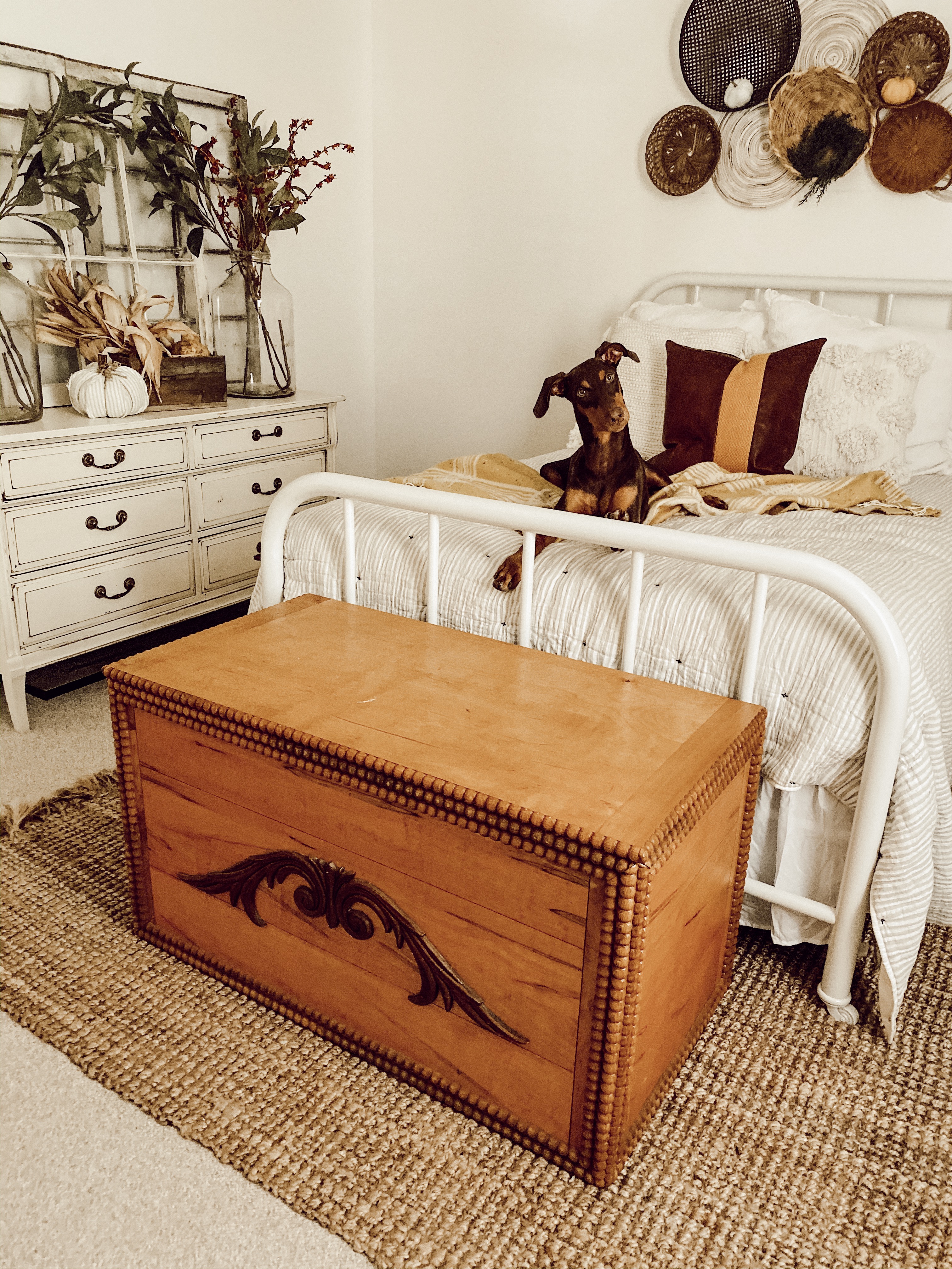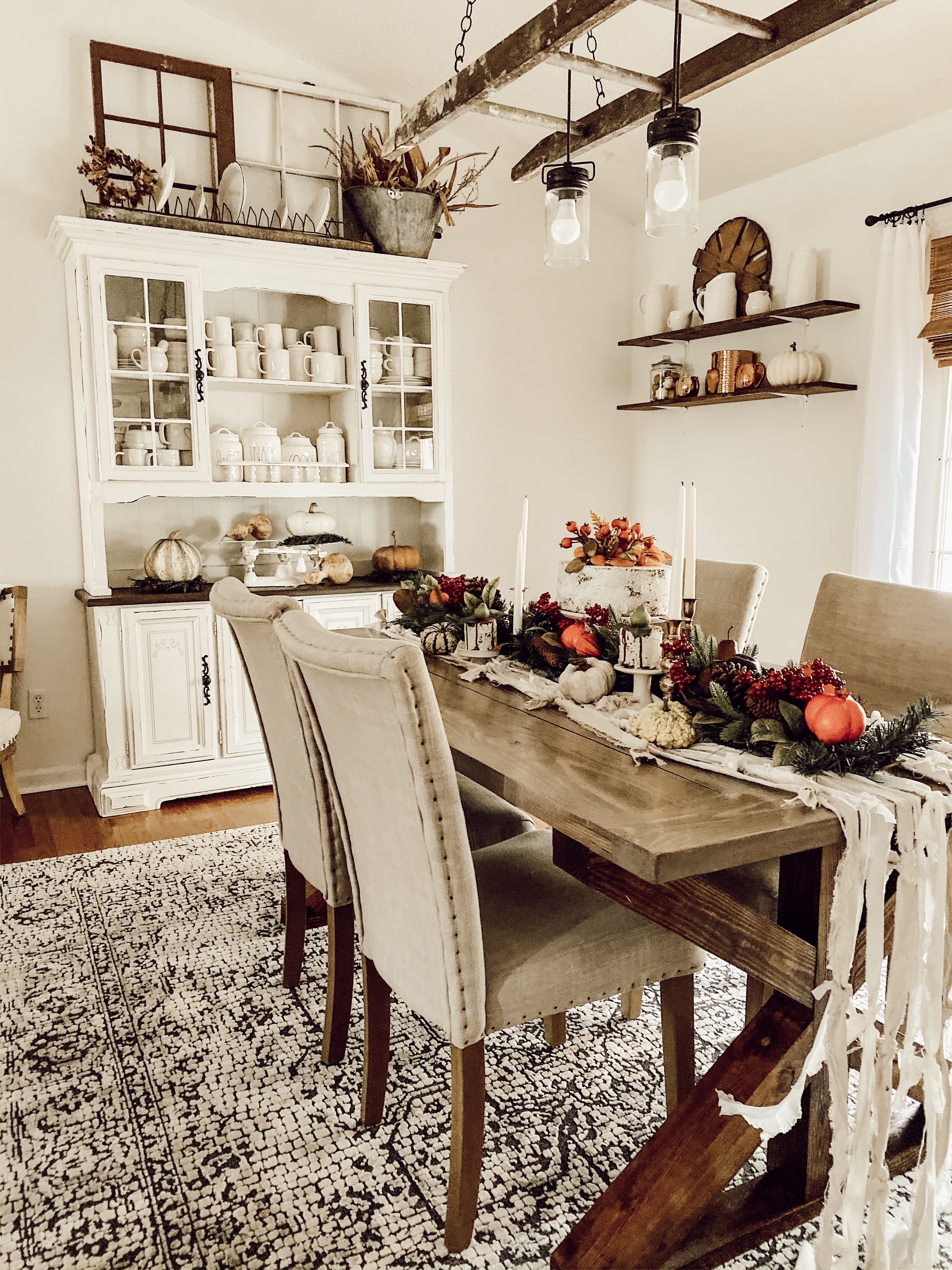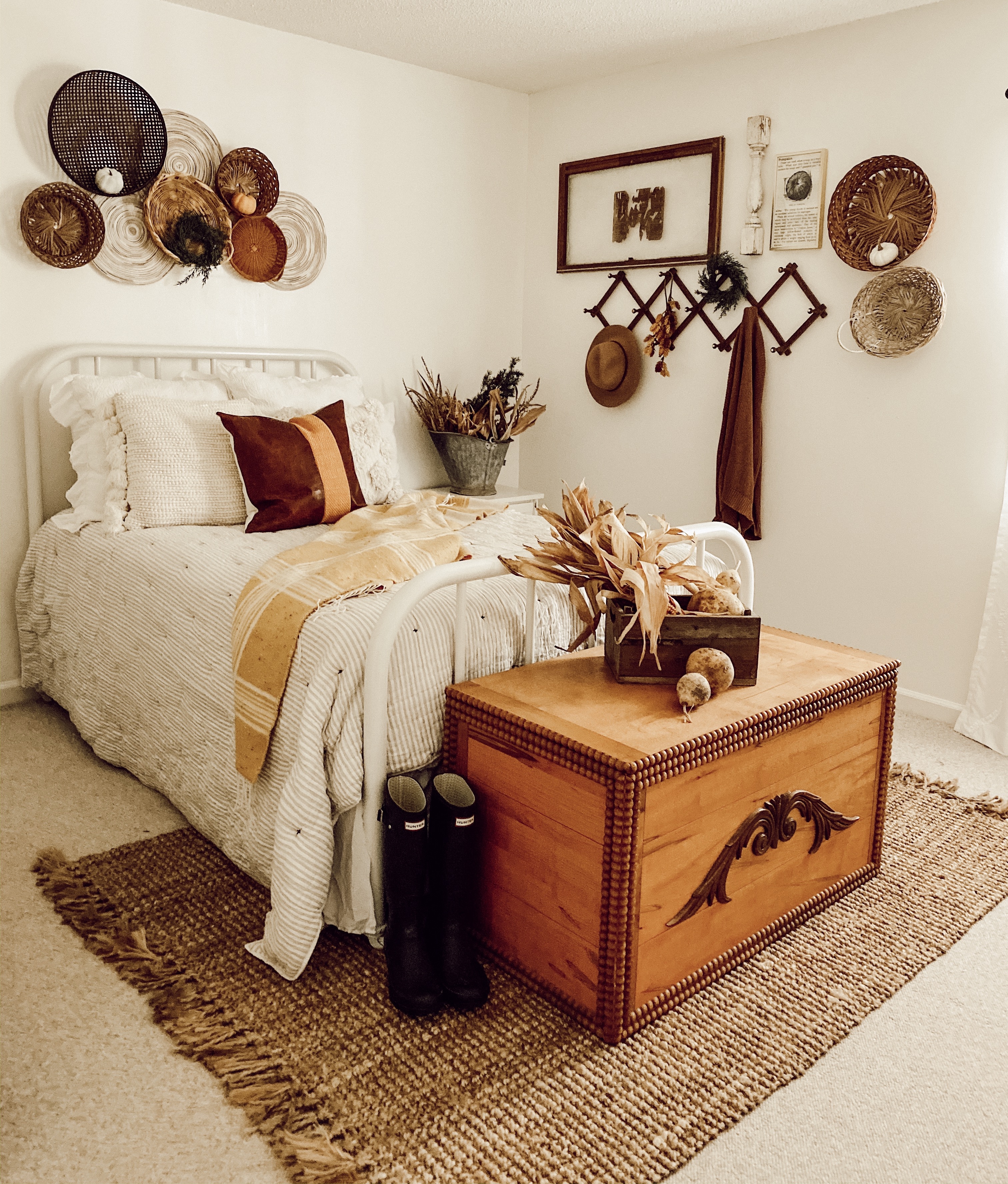 Now I will have to admit that copper tones are my favorite this time of the year and of course I had to add copper to the kitchen and the dinning room to give it all the cozy vibes along with a candle. All the tones that I layered the dining room and living room I trickled into the bedrooms that way the whole home would have a cozy Thanksgiving gathering around the table feel. In the bedrooms I pulled in the mustard tones with chunky blankets and vintage gourds. Adding in those vintage pieces I feel like just made the room feel the holiday cozy feelings that we all love and see in those amazing Hallmark movies.