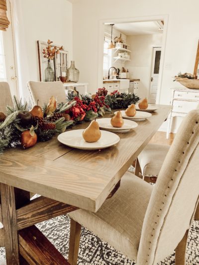 I choose to start seeing what ones of color I want to use in my Thanksgiving dinner, sounds crazy right? Well, I choose to have some desserts and those are the main attention of my table so that is where I begin. This year I am keeping the mustard tones and the tones of the pomegranates for Thanksgiving dinner. After I have decided on that I go and look through the Monica closet lol for the winter greens. Thats when you can have fun because if you’re like me you have all types of winter greens in there. I wanted to slowly bring in the winter greens, which means I picked the simple leyland cypress and the fur, this created the slow transition to Christmas decor. The center of the table layered with drop cloth fabric for the cozy tones and then a chunky piece of garland that had fall and Christmas faux foods in it, along with winter greens.
