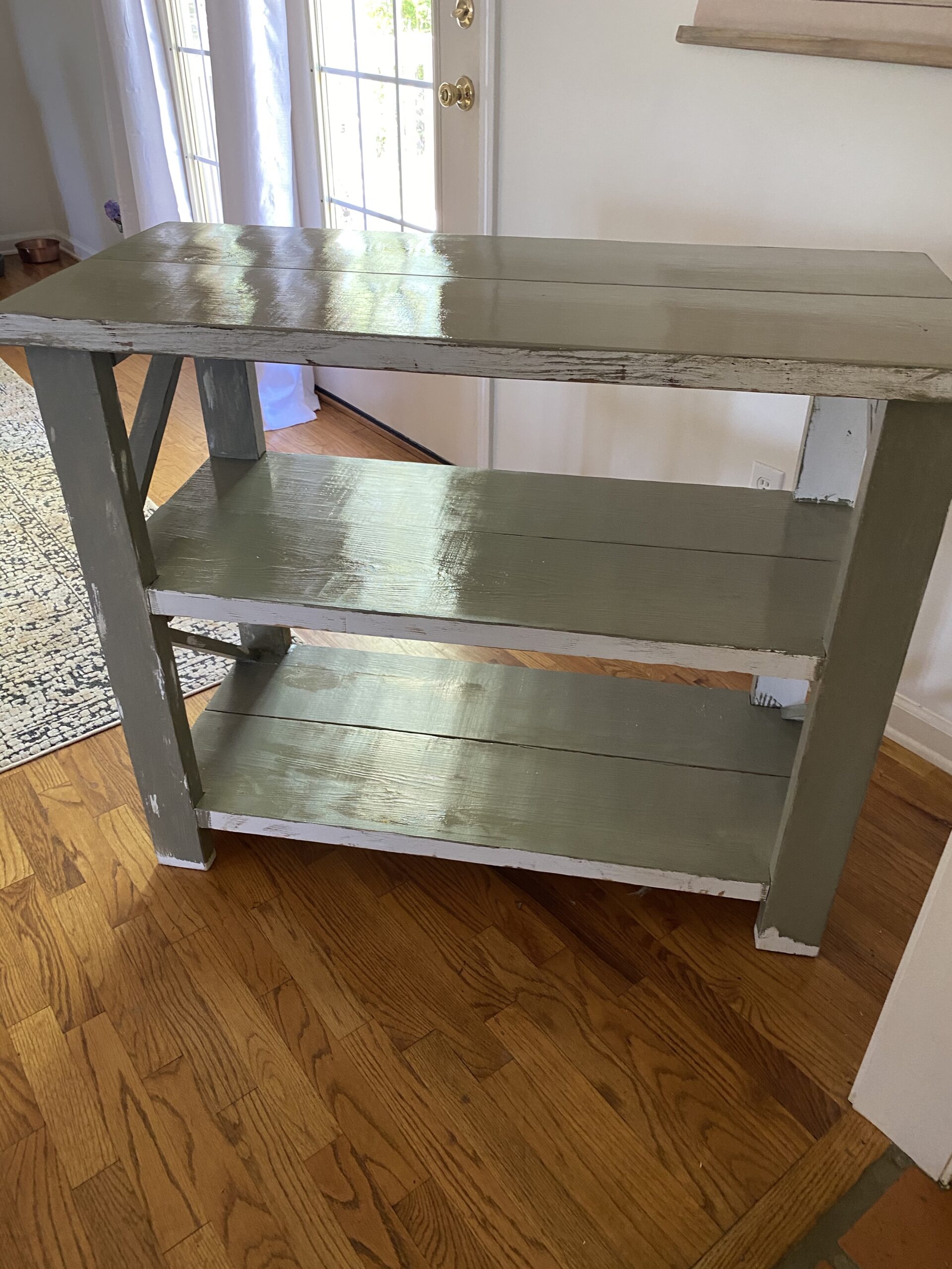 Once I dry brushed the back of the piece I waited about two mins and then I put water on my finger. Once I had the water on my finger I started to rub across the paint where I wanted it to come off and it did just that. This was exactly how I wanted to distress this piece without using a sander. I felt that if I could create this look without a sander that it would look more authentic.