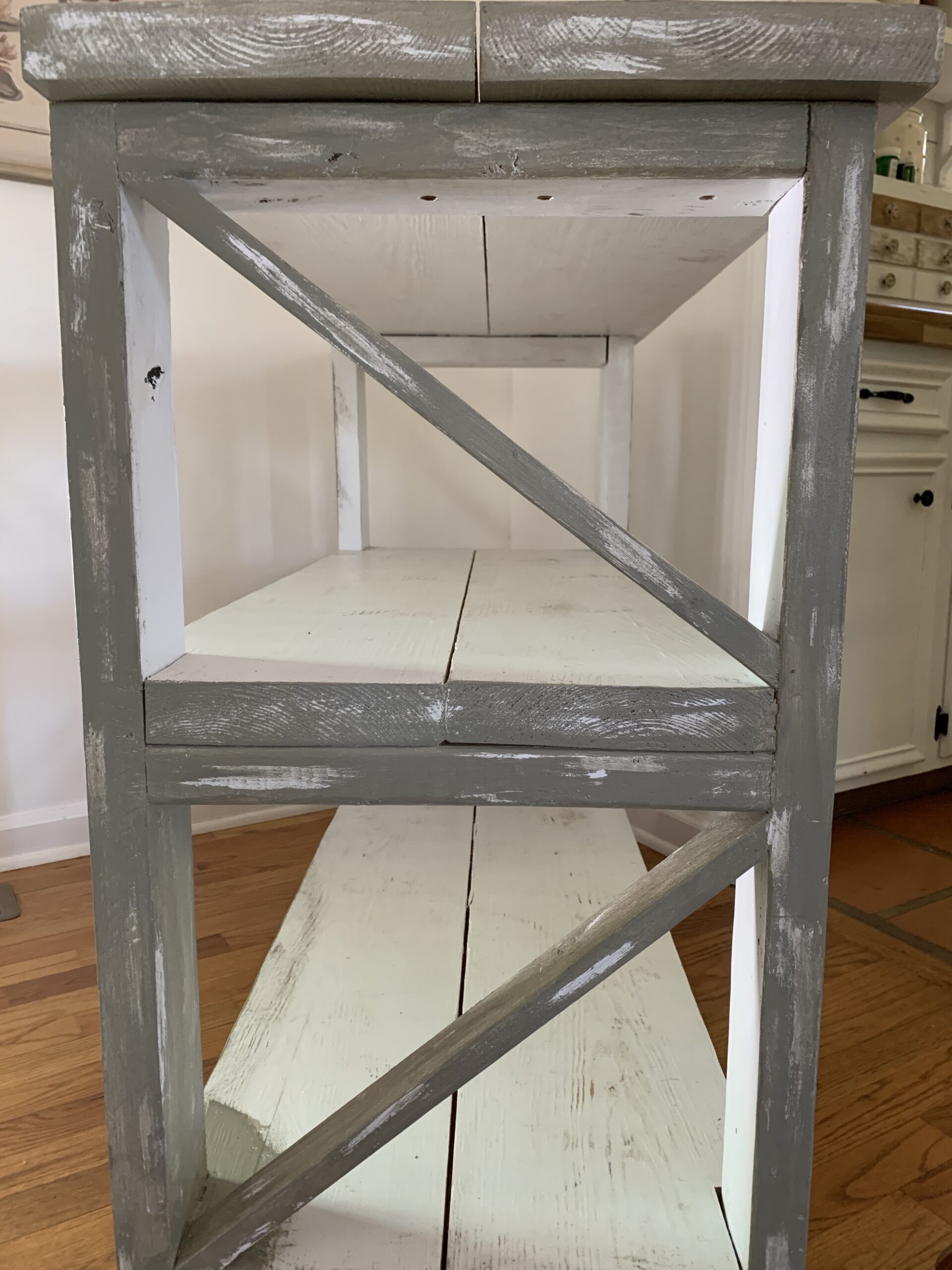 Many of you know that when I painted this piece before, I used a semi gloss white paint. This gave me a good idea on how I could make this piece look like vintage wear and tear. I started by dry brushing the back of the piece that was I could try the process that I thought that I wanted to do.